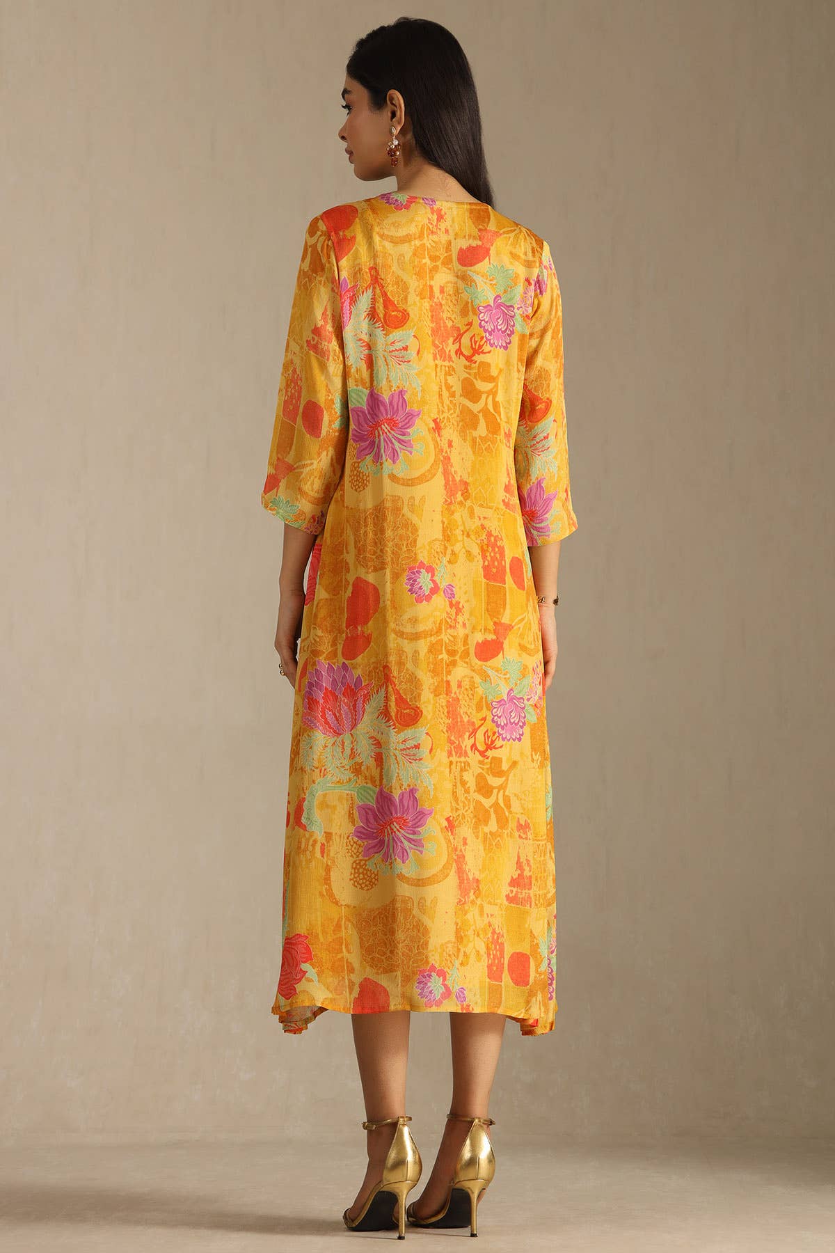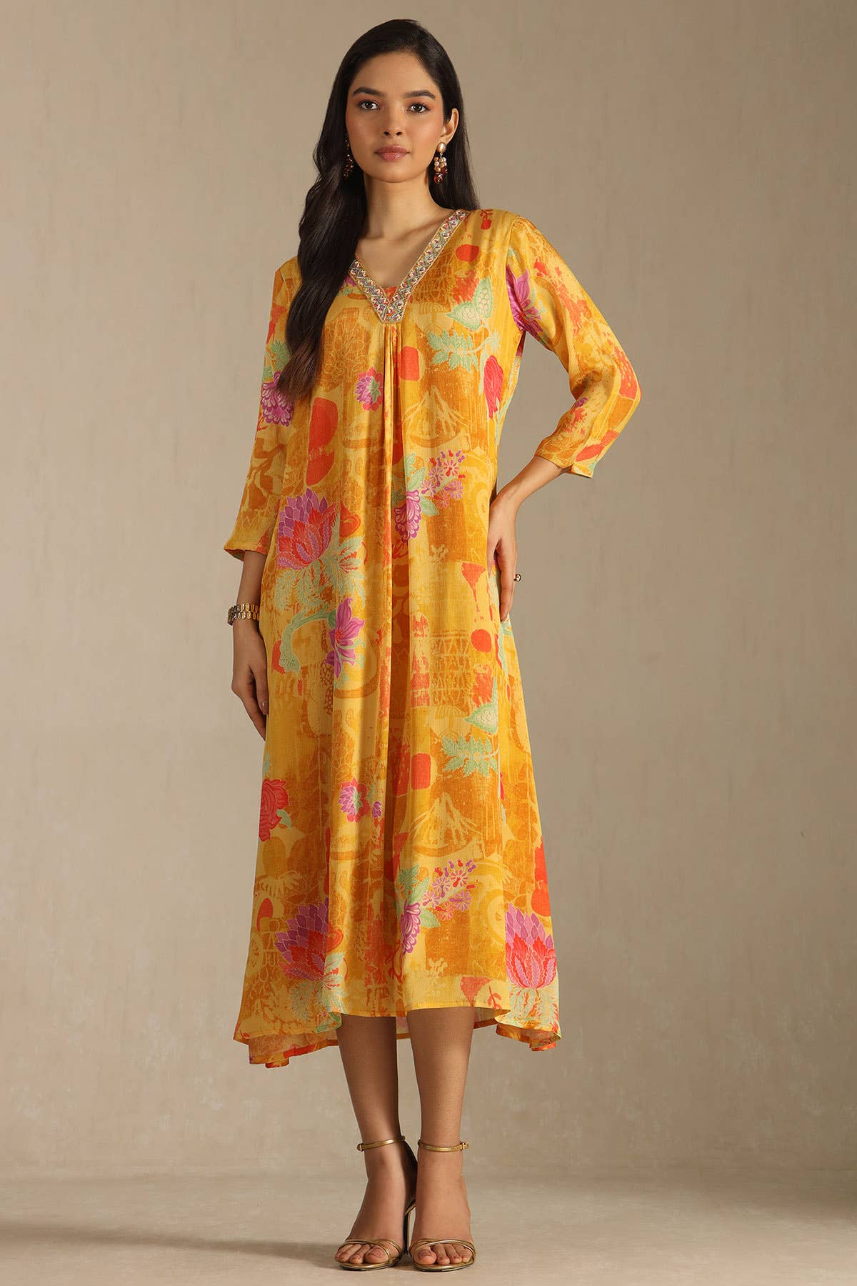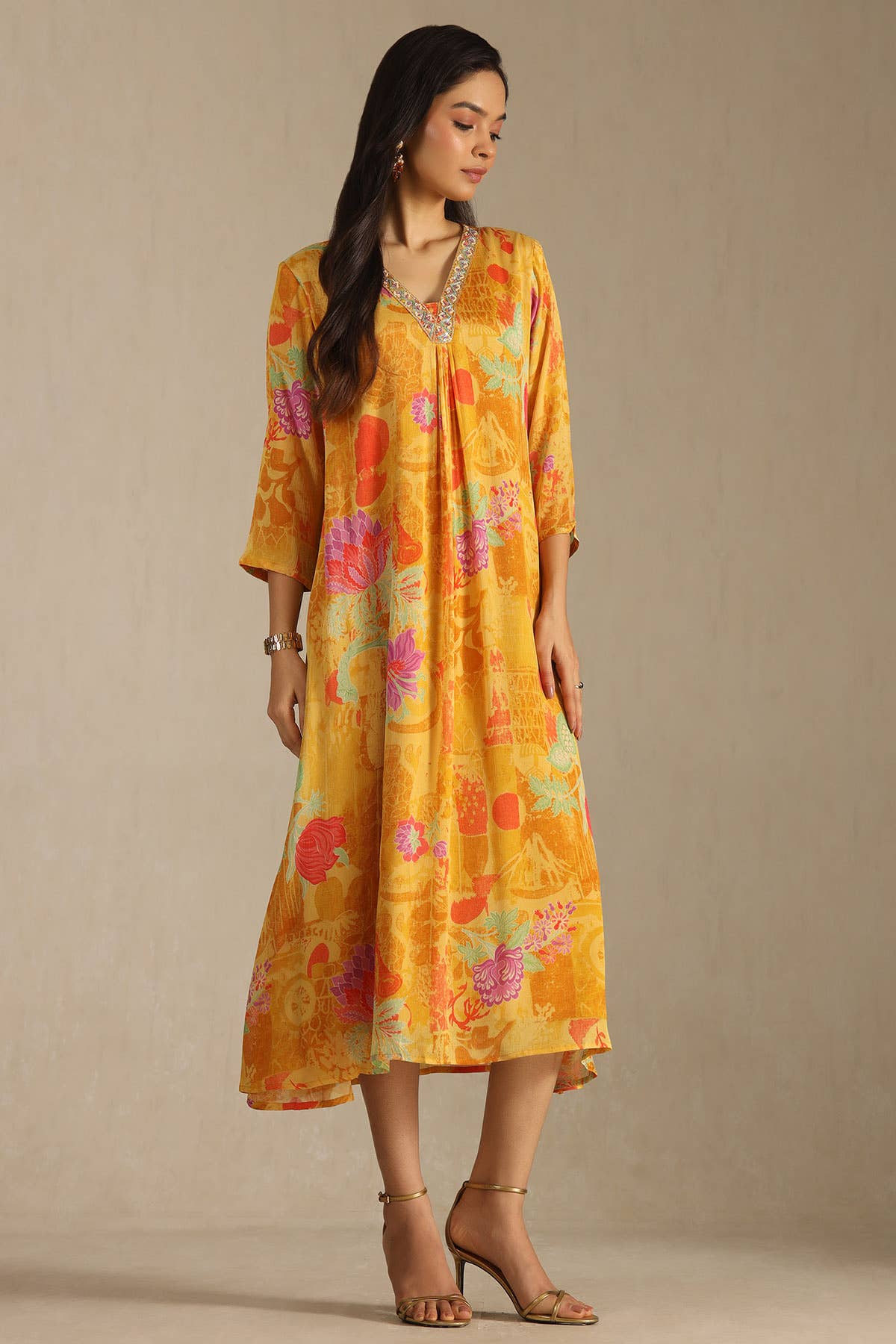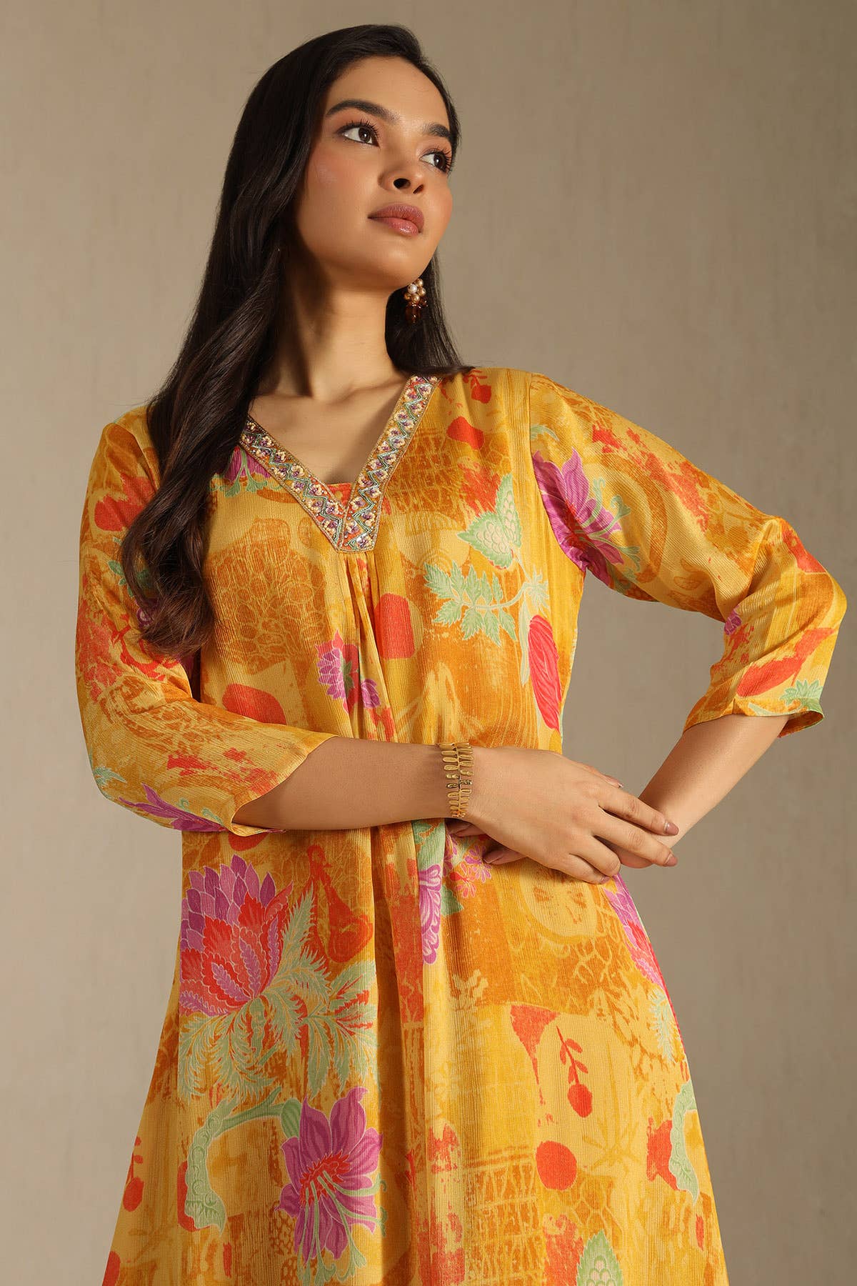 Bright and graceful, the Mustard Chinon Floral Print Dress adds a touch of festive elegance to your wardrobe. Crafted from lightweight and flowy chinon fabric, it ensures a flattering drape and comfortable wear. The vibrant mustard hue with floral prints brings freshness, while delicate bead embellishments add a refined sparkle.