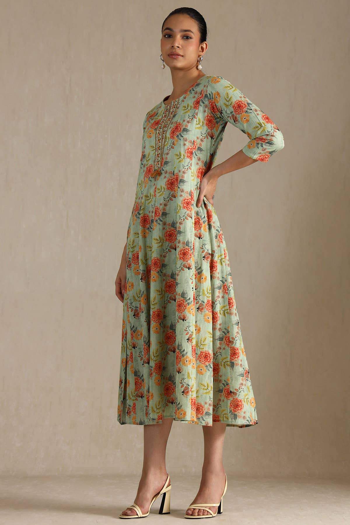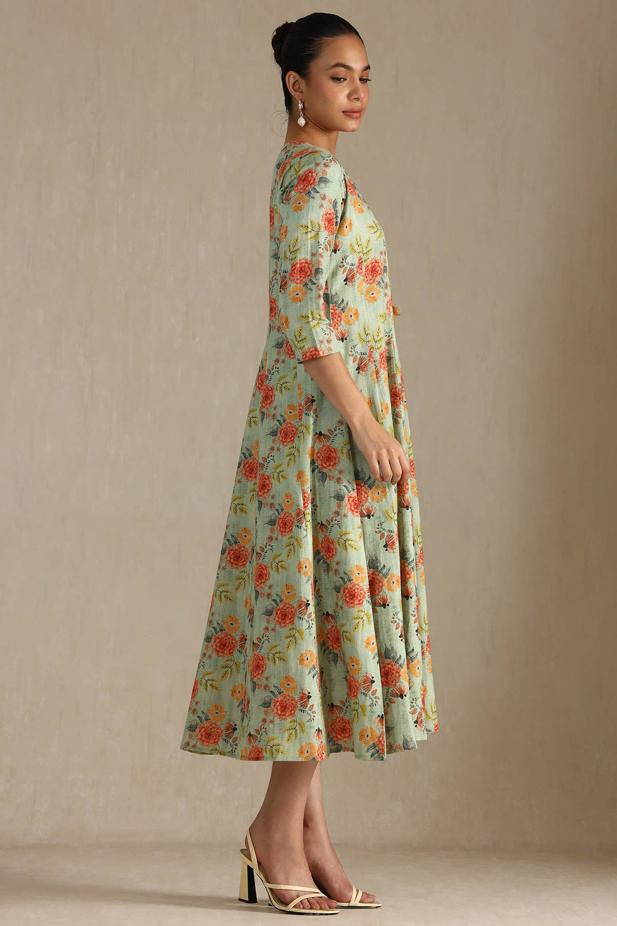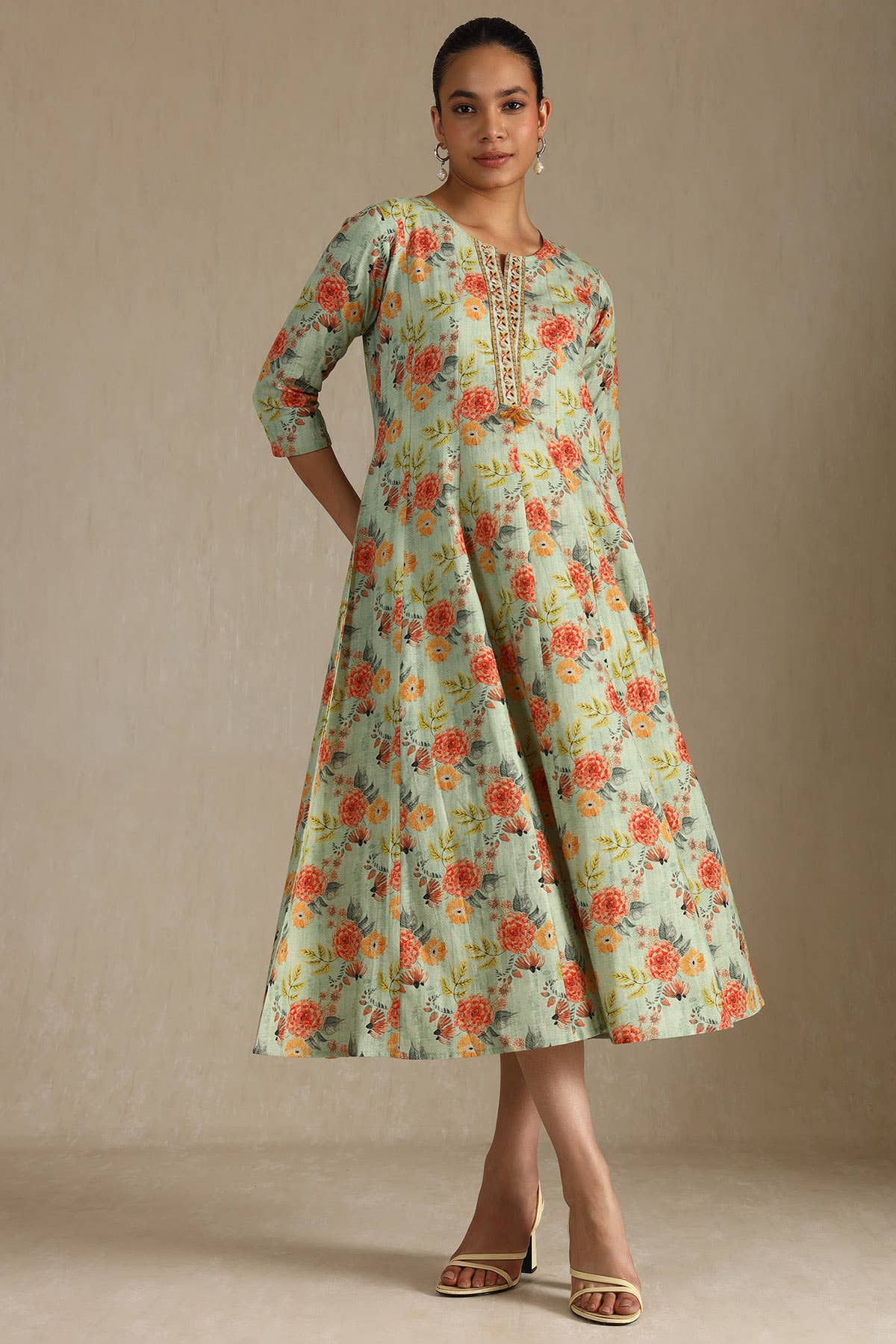 Chic and refreshing, the Sap Green Cotton Flex Floral Print Dress is a perfect blend of comfort and festive elegance. Made from breathable cotton flex, it offers a lightweight and flowy feel, ideal for day-to-evening wear. The soothing sap green base is enhanced with delicate floral prints, while subtle cutdana embellishments add a graceful shimmer for special occasions.